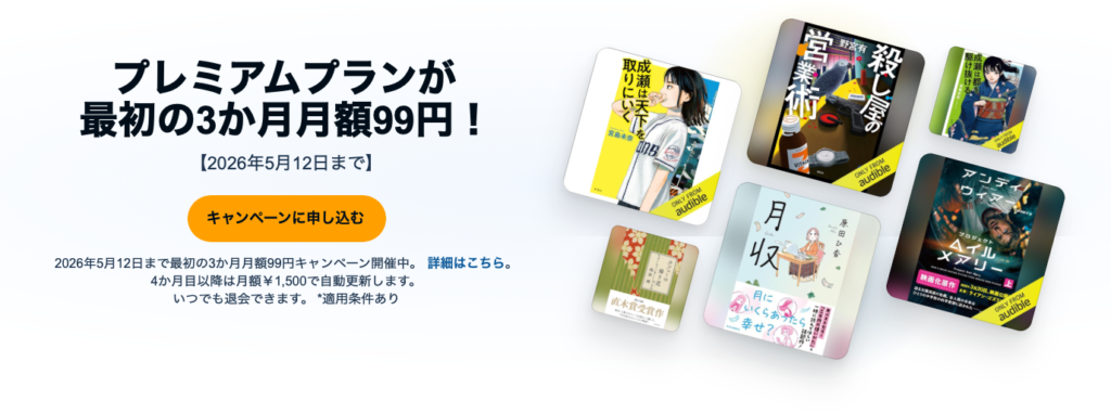 Audibleも30日間の無料体験や、たった100円での体験期間があります。