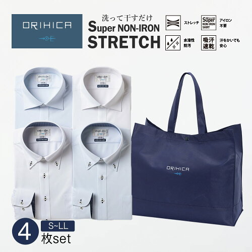 福袋 ワイシャツ 長袖 4枚セット ノーアイロン 無地 白 ブルー ボタンダウン ワイドカラー スーパーノンアイロンストレッチシャツ Yシャツ ビジネス ドレスシャツ ハッピーバッグ ORIHICA オリヒカ
